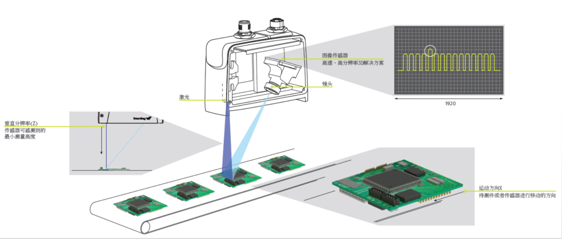 通過將激光線束投射到被測物體表面反射回圖像傳感器,獲取激光線束與圖像傳感器的偏移角度,隨著被測物體高度在不同點位的變化,反射激光線束在圖像中呈現(xiàn)不同位置,從而實現(xiàn)對物體輪廓的測量,并利用被測物體與3D傳感器的相對位移生成被測物體的完整的3D數(shù)據(jù)輪廓。