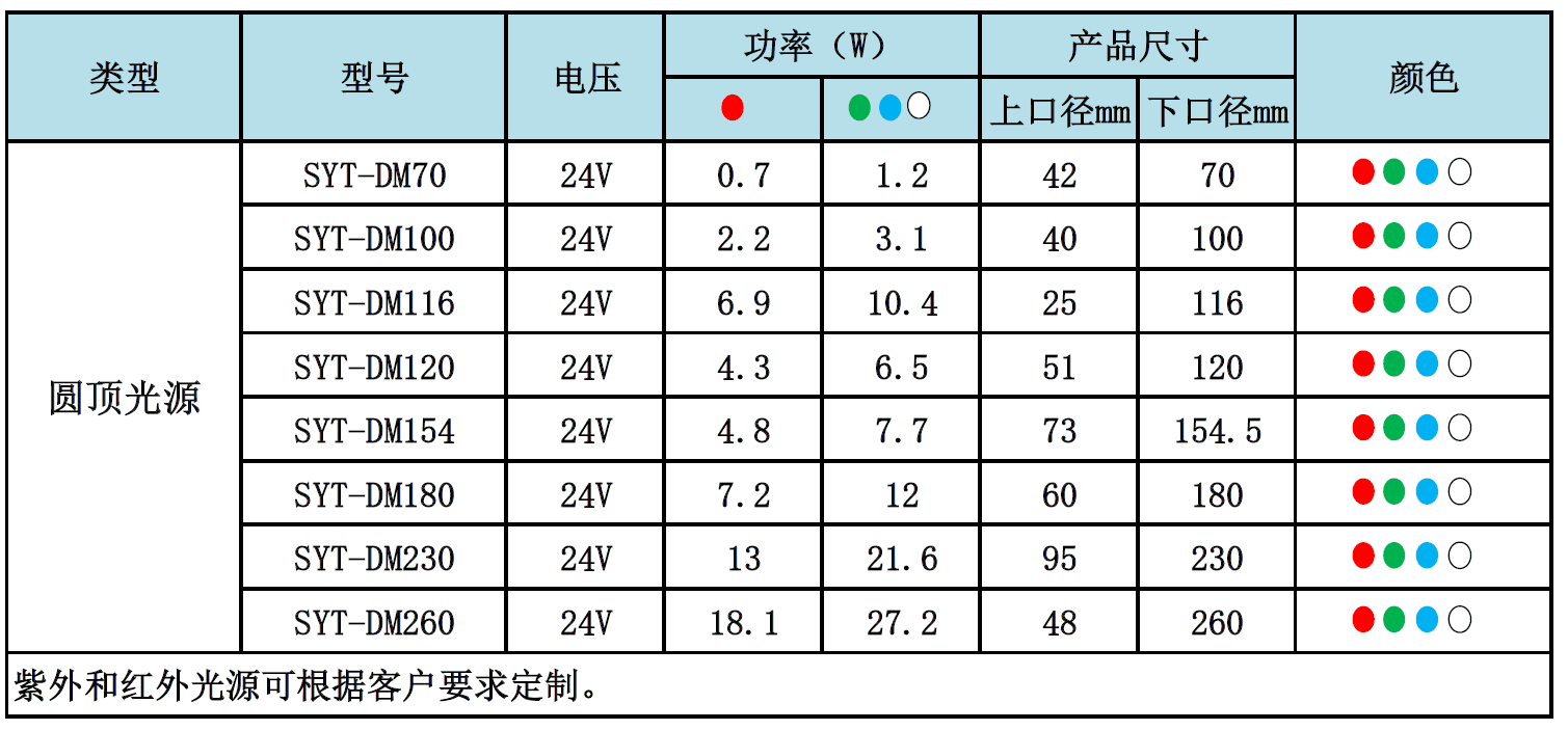 SYT-DM環(huán)形光源系列 SYT - DM ## ## - R/G/B/W/IR/UV 公司名 種類 直徑 角度 顏色
